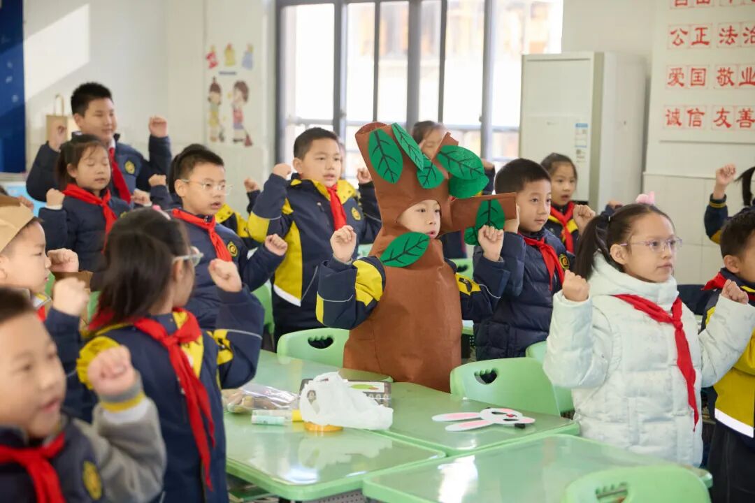 姚怡老师将《劳动最光荣》拆分为“走进劳动月”“致敬劳动者”“劳动创美好”三个板块,通过劳动知识竞赛、《守株待兔》情景剧、树叶贴画制作等丰富活动,让学生在趣味学习中感悟劳动意义,播下热爱劳动、崇尚实干的种子。