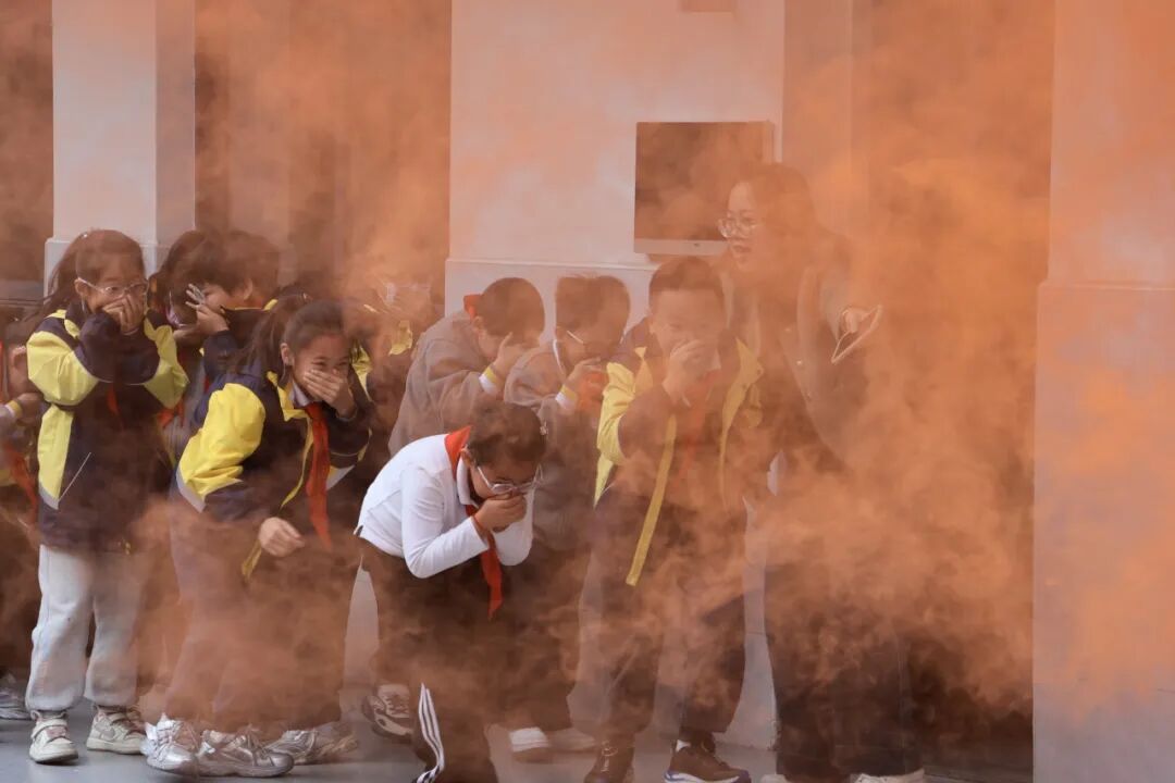 “呜——呜——”急促的警报声骤然响起,同学们立刻用湿毛巾捂住口鼻,弯腰小步快速跟进,沿着既定路线向安全区域有序疏散;老师们在走廊、楼梯口全程引导,维持秩序。整个过程紧张有序、忙而不乱,短短几分钟内,全校师生便安全集结完毕。这场演练,成功将书本上的消防知识转化为实实在在的逃生技能。